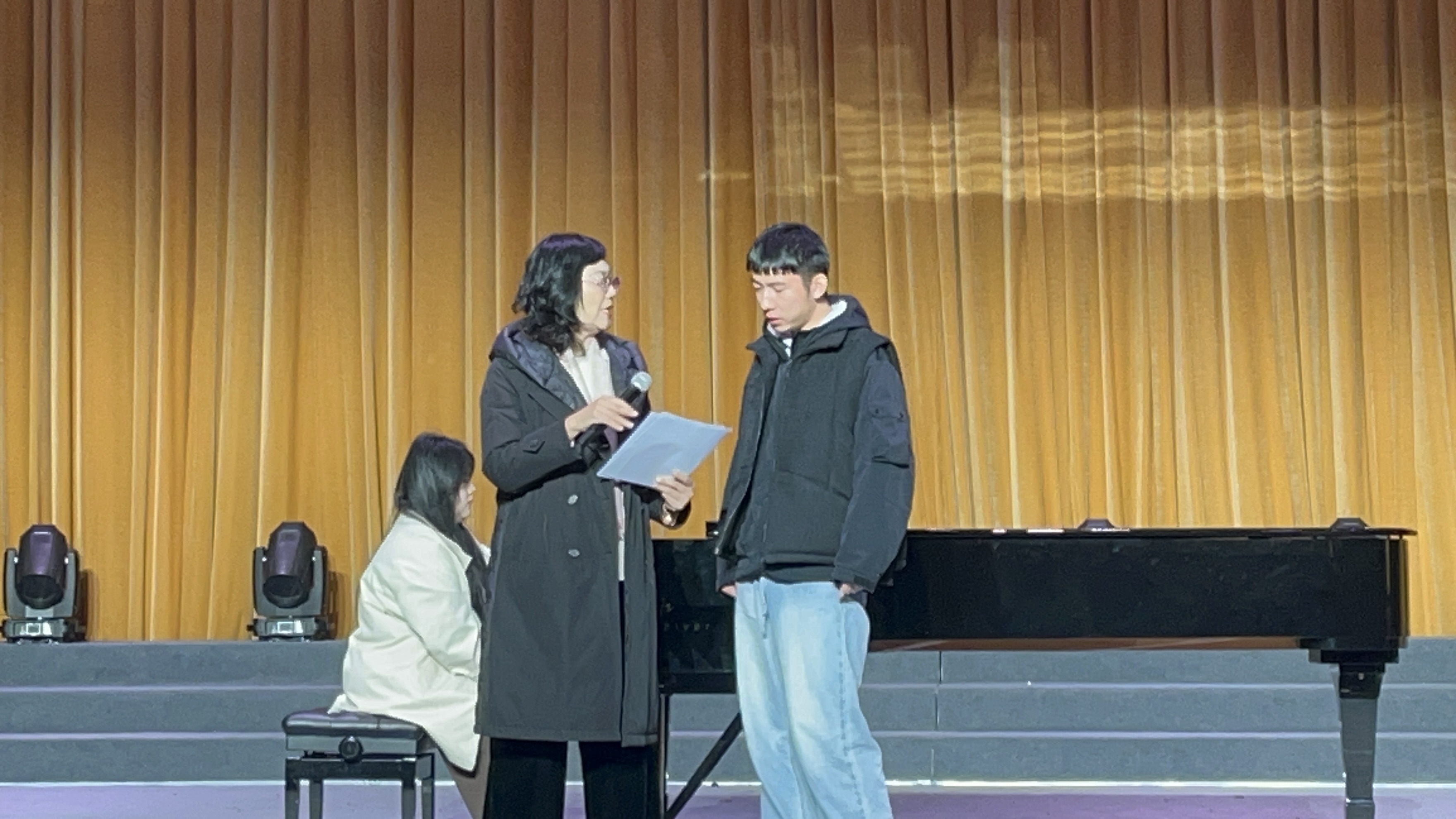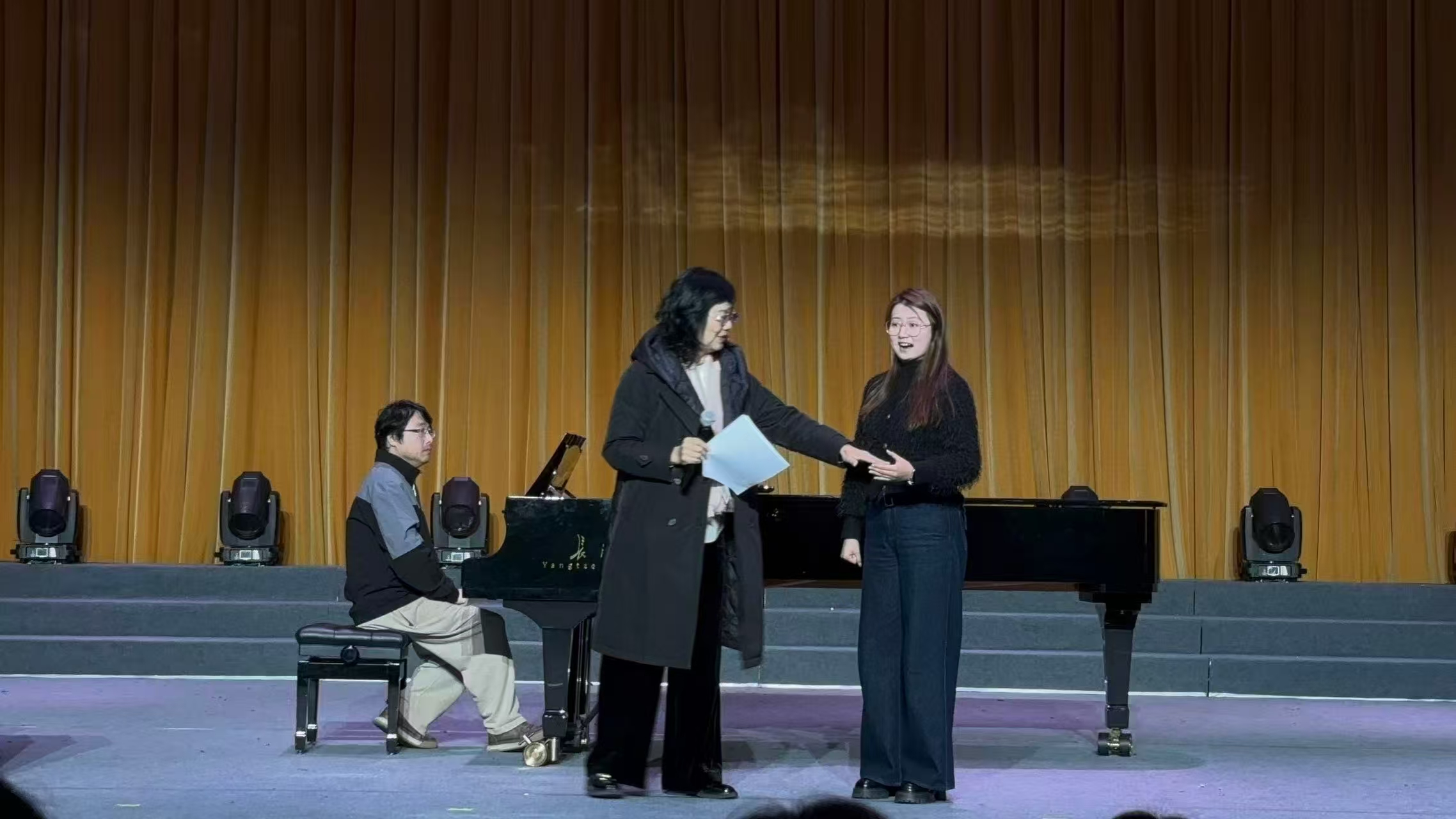 讲座现场,三位研究生分别演唱《黄河渔娘》《越人歌》《亲疙瘩下河洗衣裳》,余惠承教授逐一进行精准点评与现场指导。