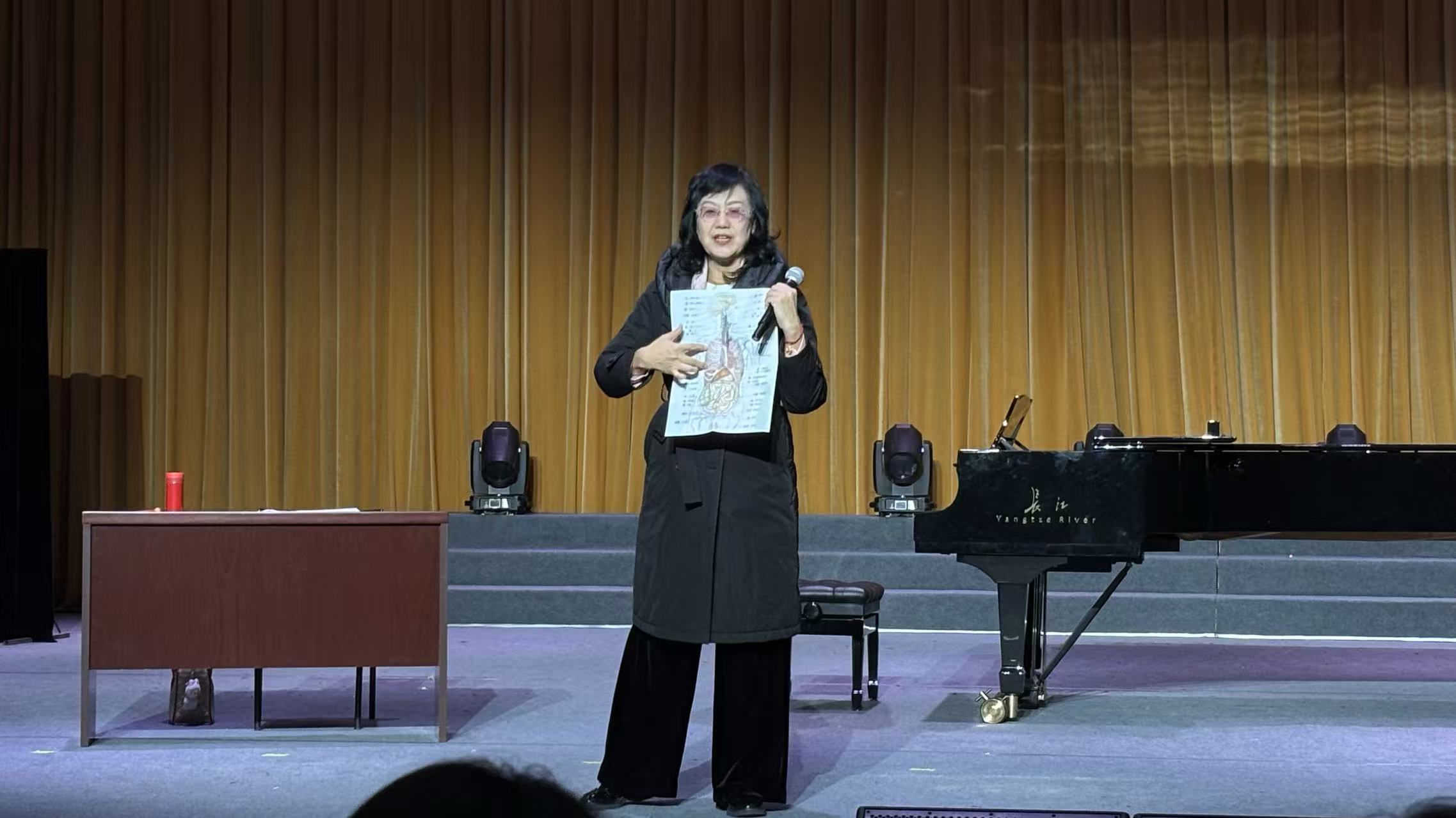 讲座开篇,余惠承教授直指歌唱核心,围绕“气息”这一关键命题展开阐释。针对员工普遍存在的“气吸不到位”“片面理解气沉丹田”等困惑,她结合人体生理结构图示,清晰解析肺部的生理位置与功能,指出吸气过浅、刻意控制气息等常见错误会阻碍科学发声,强调“认真吸气、自然支撑”的重要性。
